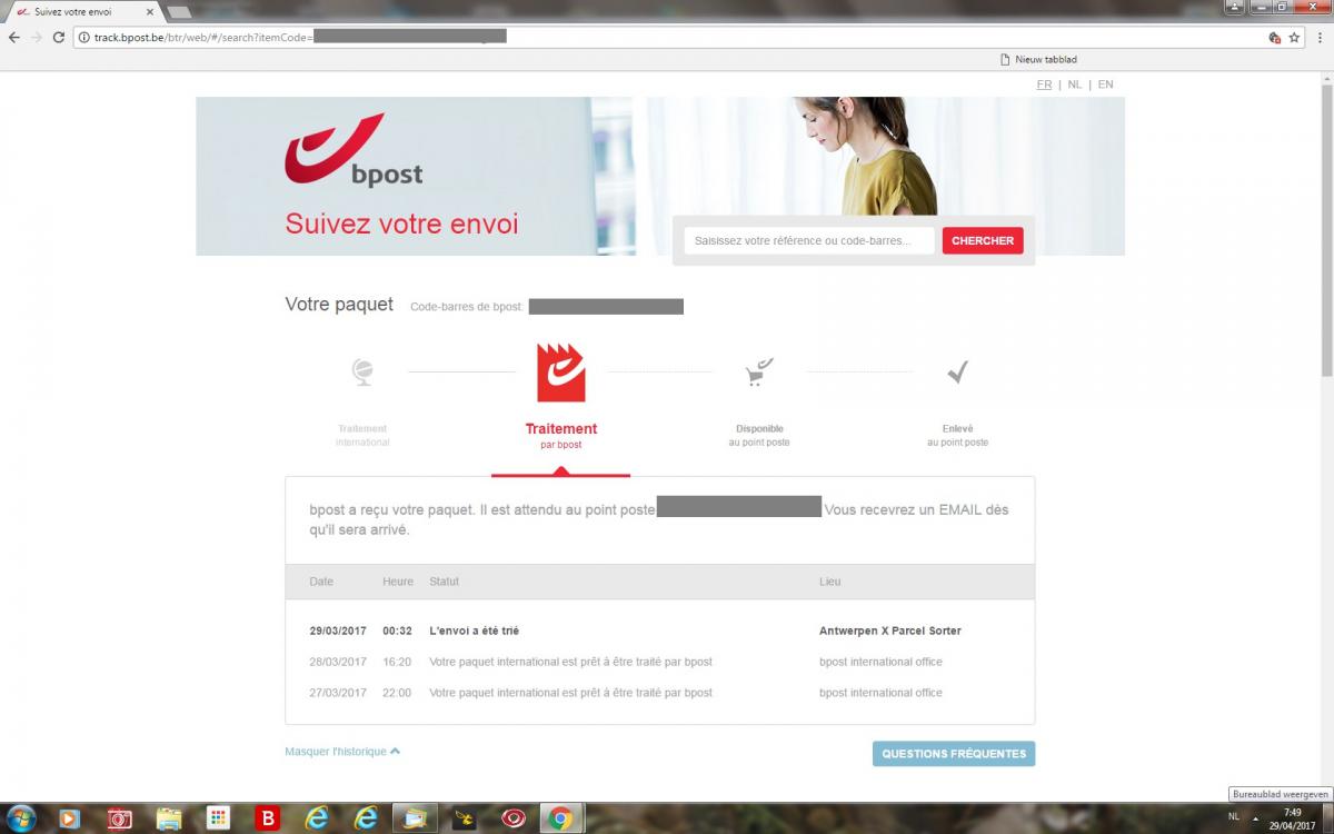 meganeura 273 Posté(e) 29 avril 2017 Idem pour moi, problème avec une livraison de commande chez Studio sport,mais pas avec Studio Sport ! Généralement,je commande le dimanche soir pour réceptionner mon paquet le mercredi ou le jeudi ( je suis en belgique ) Après une semaine,rien,le paquet se trouve toujours au centre de tri d'Anvers. J'en informe SS qui prend immédiatement contact avec Colissimo,puis Bpost,et me confirme qu'il y a visiblement un problème de flashage du paquet, et me demande de les rappeler si la situation n'évolue pas rapidement. Quelque jours plus tard,j'ai pu réceptionner mon paquet alors qu'il se trouve toujours en dispaching à Anvers 1 mois plus tard ! voir foto et la date sur mon PC en bas à droite Partager ce message Lien à poster Partager sur d’autres sites