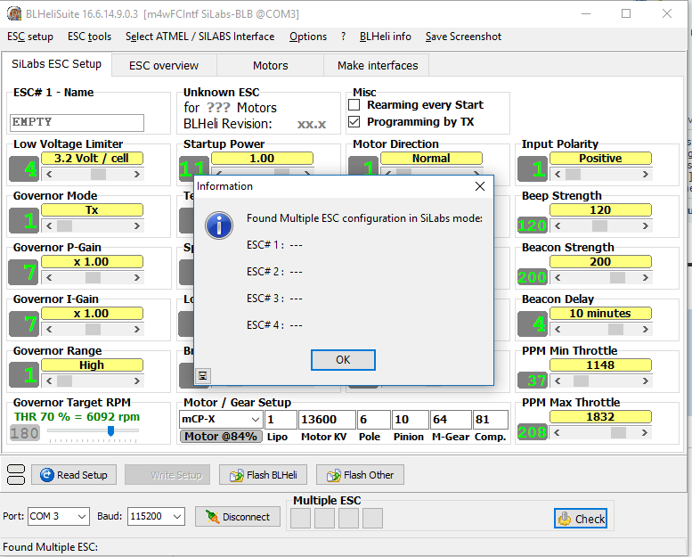 axel5453 7 Posté(e) 16 août 2017 bonjour ! j'ai flashé mon eachine 250 racer F3 avec betaflight, tous marche bien, mais je n'arrive pas à calibrer les moteurs. j'ai donc essayé avec BLheli, lorsque je fais read setup le logiciel ne détecte pas les ESC merci de votre aide ! Partager ce message Lien à poster Partager sur d’autres sites