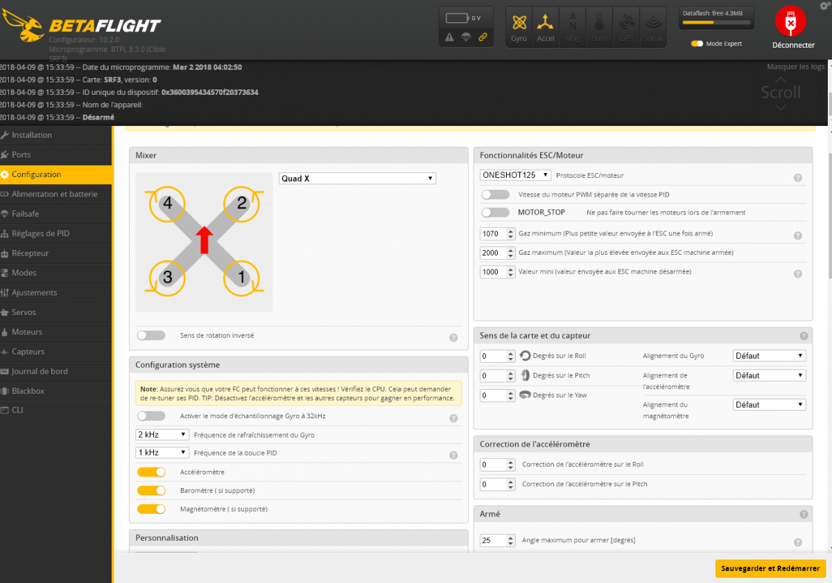 pascm 0 Posté(e) 3 avril 2018 Merci pour vos réponses. @yoyo2611 : comment on le met en stabiliser ? (je suis débutant en quadricopters) @bruno90 : oui je mets bien les gaz franchement. Je viens de refaire le teste à l'instant. Résultat il monte de 70cm se retourne brutalement et coupe les gaz tout seul pour aller se fracasser par terre... Quand je joue un peu avec dans l'onglet sensors de betaflight les capteurs ont pourtant l'air de fonctionner... Merci pour votre aide Partager ce message Lien à poster Partager sur d’autres sites